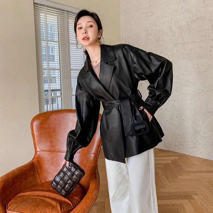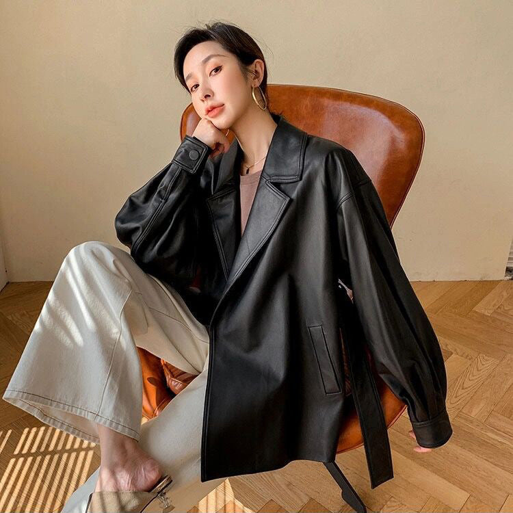 All-match Loose Belt Small Leather Jacket
