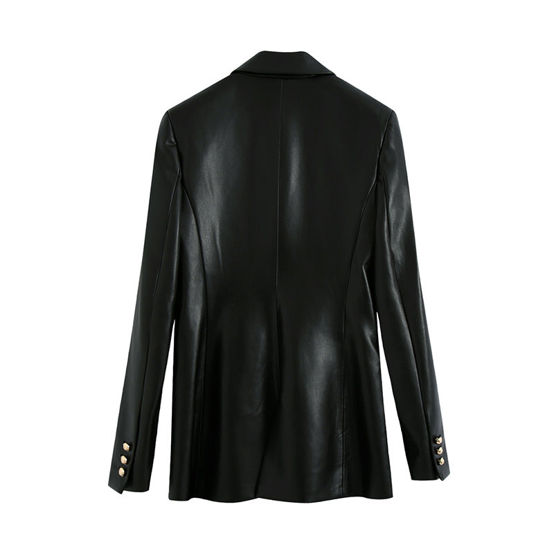 Black Faux Leather Gold Double-Breasted Long Sleeve Lapel Suit