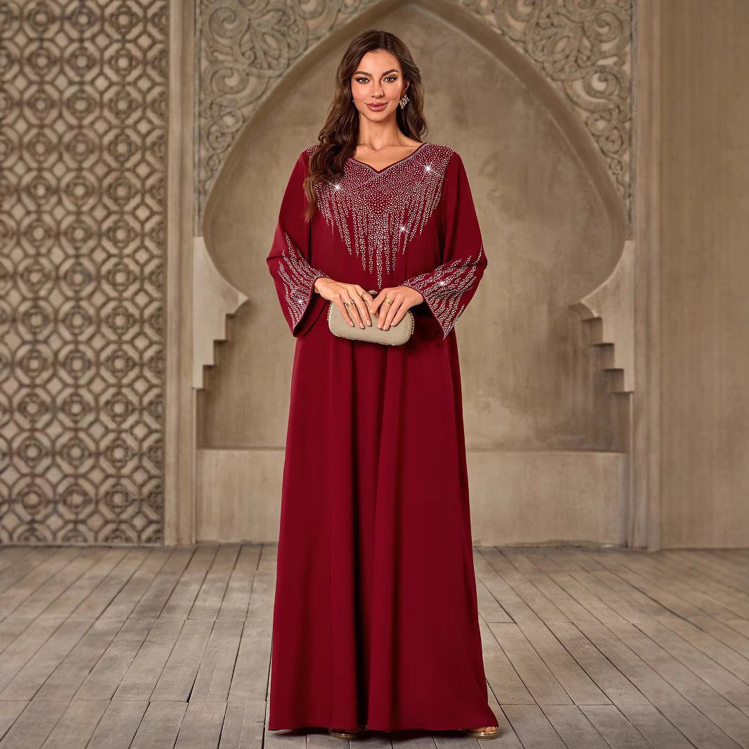 Fashion Rhinestone V-neck Casual Loose Dubai New Dress