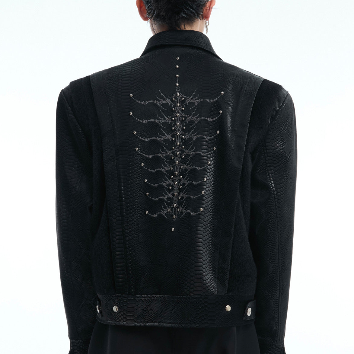 Niche Pattern Snakeskin Stitching Jacket Rivet Embroidery PU Leather Coat