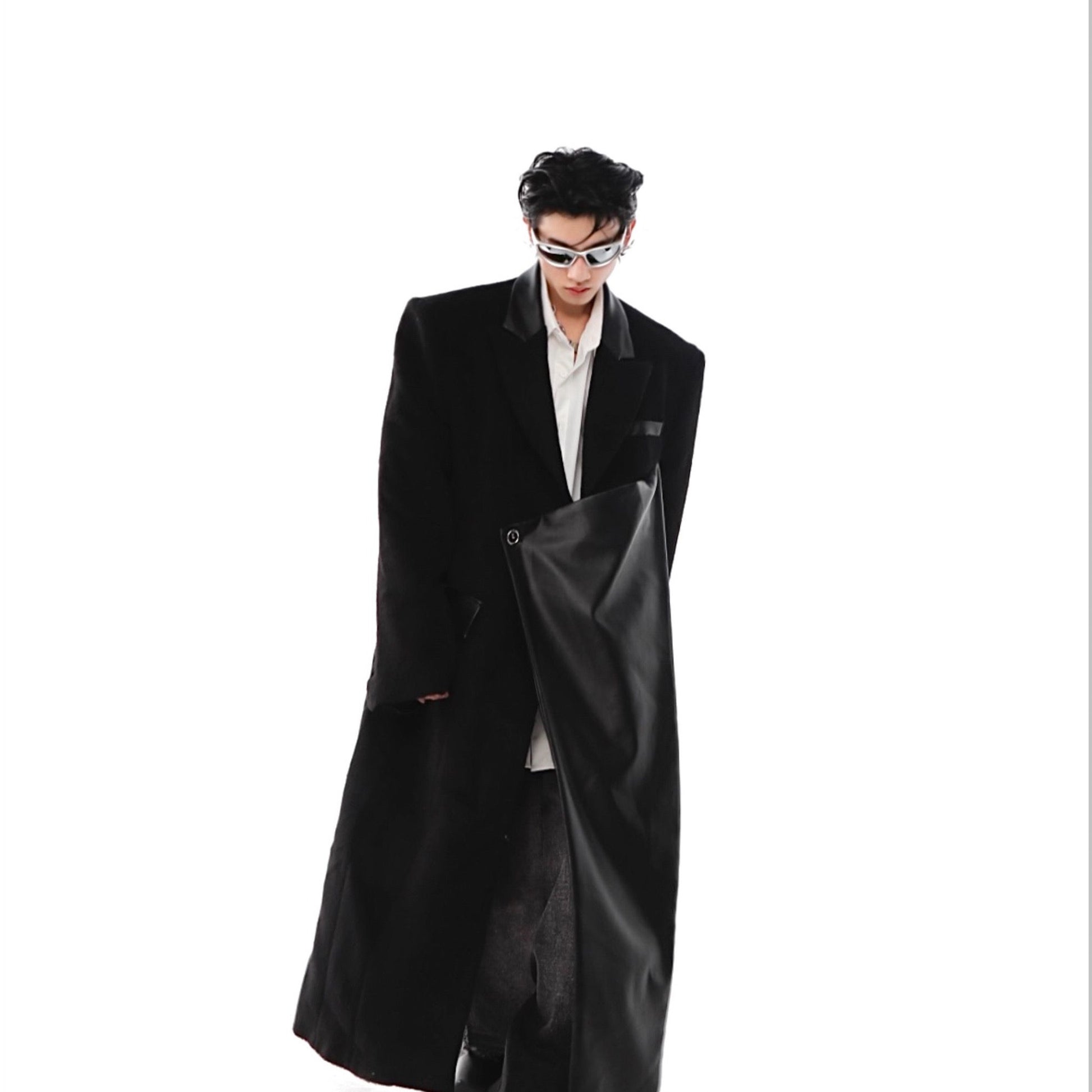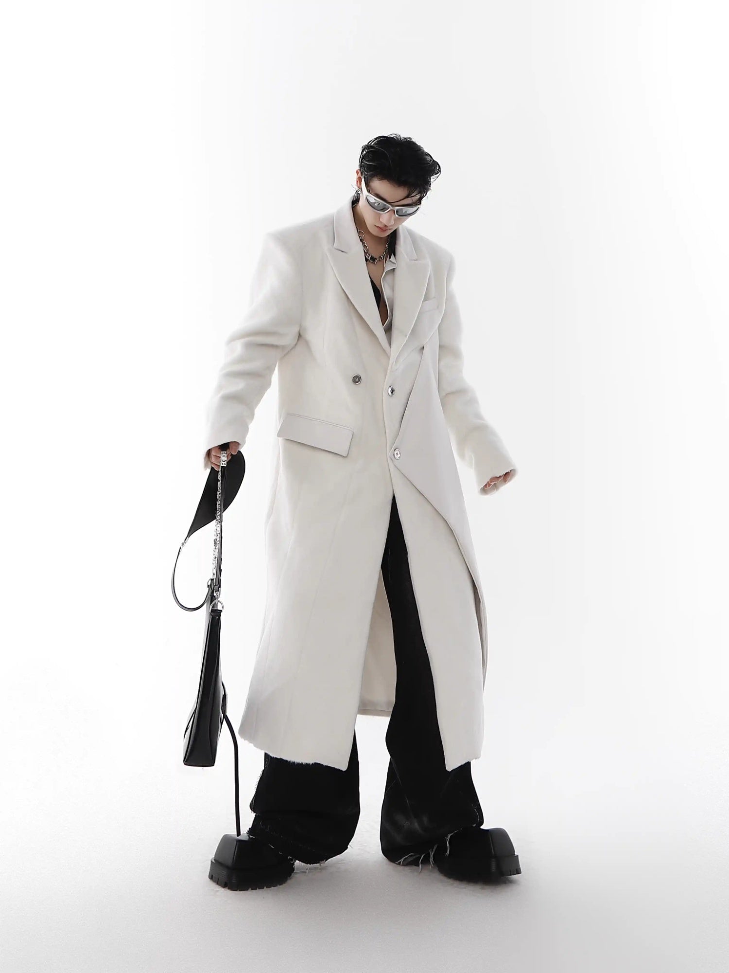 Padded Shoulder Woolen Coat PU Leather Stitching Design Long Trench Coat White Over The Knee